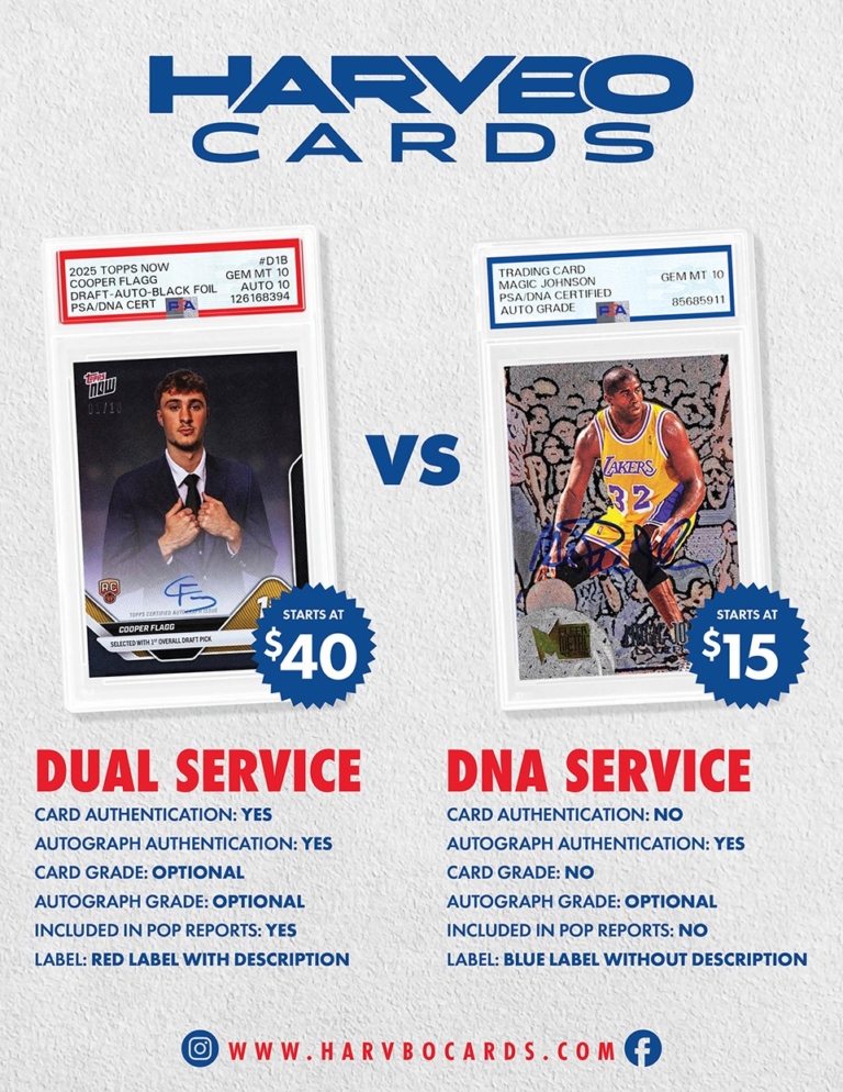 PSA has 2 different Authentication Services. Dual Service & DNA Service. These 2 services have Pro’s and Con’s for each. Please see the graphic below to see the differences between the two.